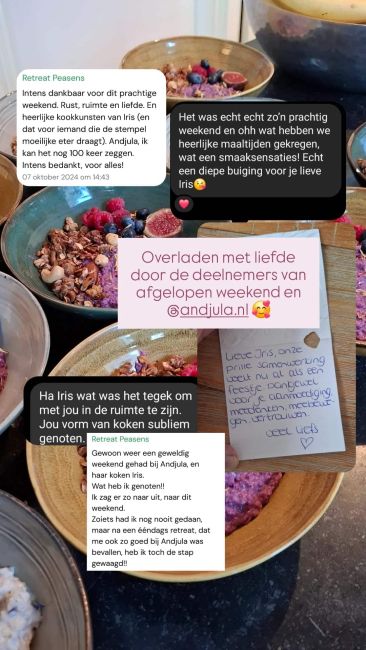 Het is iedere keer weer een genot om met Iris samen te werken. Niet alleen omdat ze heerlijke en gezonde gerechten bereidt die perfect aansluiten bij de aard van onze retraites, maar ook omdat ze veel kennis en ervaring met zich meebrengt op het gebied van holistische voeding en gezondheid. De manier waarop ze passievol in contact gaat met onze klanten is wat ons betreft het kersje op de taart. Daarom kunnen wij niet anders dan uitkijken naar onze volgende samenwerking!