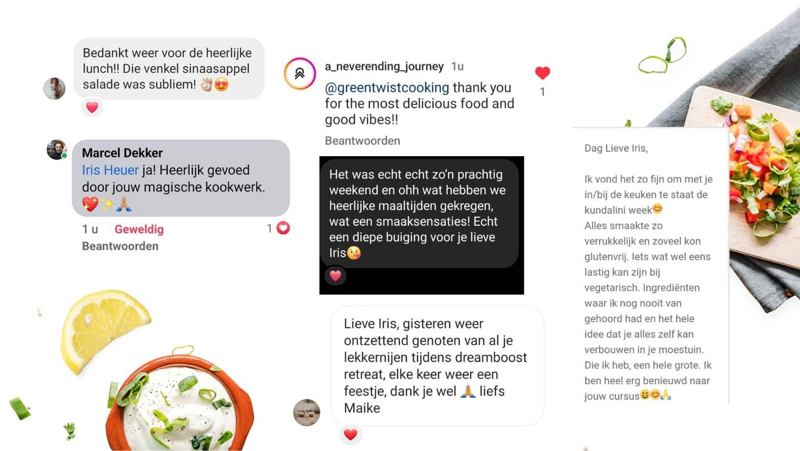 In onze retreat locatie, de Wierschuur, komen veel verschillende chefs koken die door organisatoren van retreats worden ingehuurd. Iris viel ons in de eerste instantie op doordat zij de keuken zo blinkend schoon achter liet. Toen wij Iris zelf voor een zakelijke reservering uitnodigden in de Wierschuur te komen koken vielen ons de enthousiaste reacties van onze gasten op. Sindsdien is Iris een graag geziene chef in de Wierschuur waar terugkerende gasten stelselmatig naar vragen.
