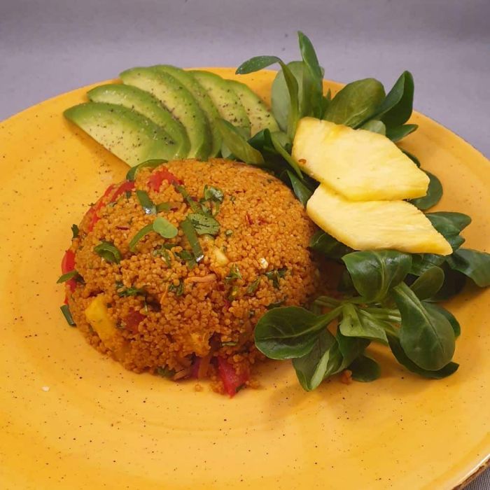 • Snijd alle verse kruiden, groenten en ananas/appel zoals aangegeven, let op dat je bij de tomaten de vochtkern eruit haalt. En meng deze met de quinoa