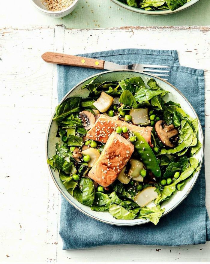 - Leg hier de zalmfilets bovenop, garneer af met sesamzaadjes