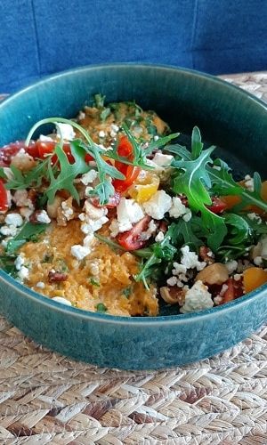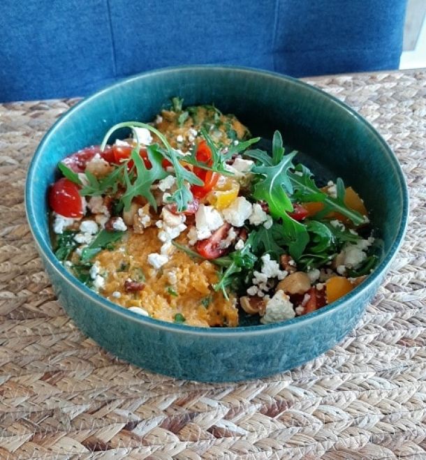 - Avocado & spinazie met cottage cheese en ras el hanout (specerijenmix)