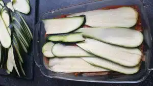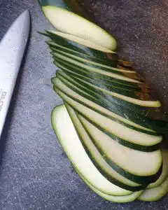 - Snijd dunne plakken van de courgette om de "lasagne bladen" te maken (zie foto)